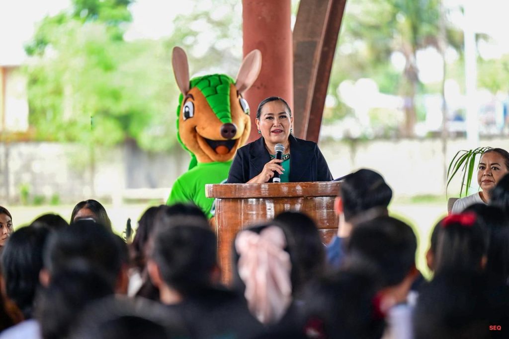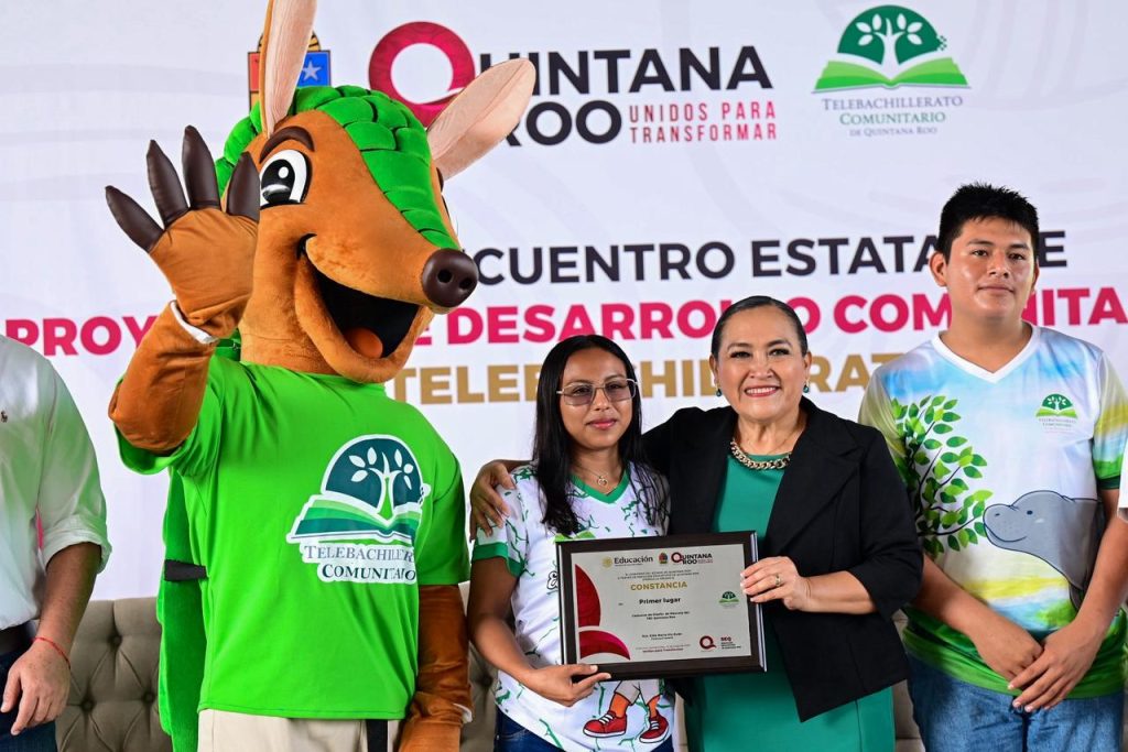 La titular de la SEQ también presentó a “Weech” (Armadillo), la mascota oficial del Telebachillerato Comunitario de Quintana Roo, además entregó un reconocimiento a la ex alumna del Telebachillerato Kancabchen, Harumi Jhoana Olán Kú, creadora de la mascota.