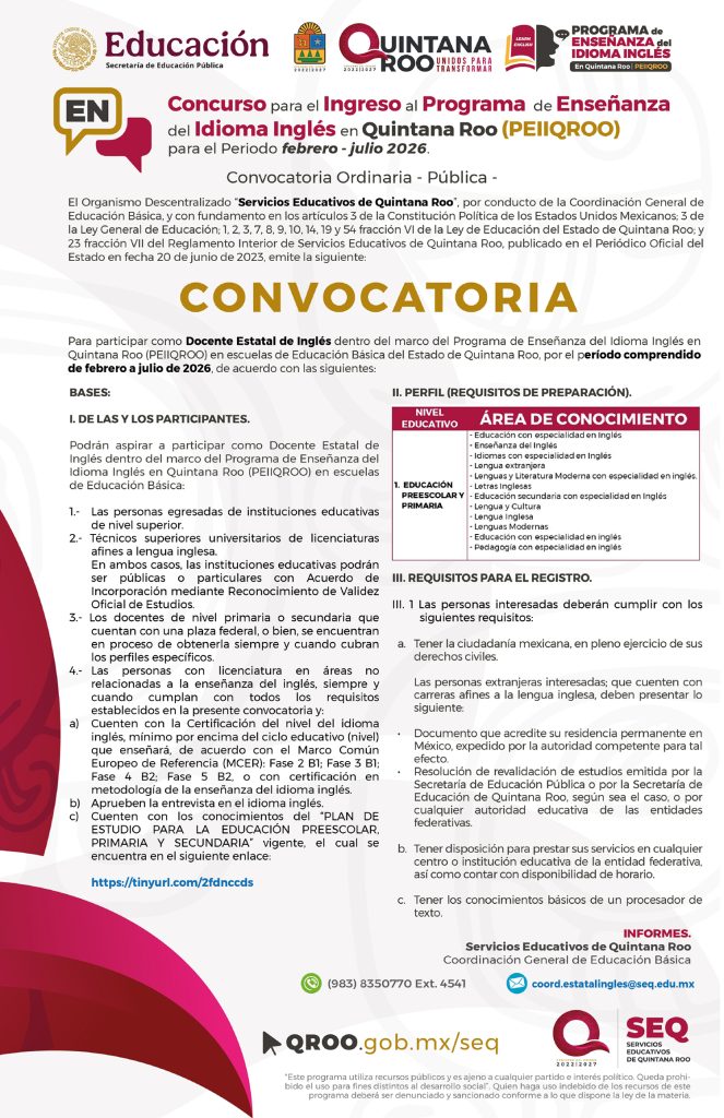 Concurso para el Ingreso al Programa de Enseñanza del Idioma Inglés en Quintana Roo (PEIIQROO) para el Periodo febrero – julio 2026 | Convocatoria Ordinaria – Pública 07/01/202606/01/2026 por Comunicación Social SEQ