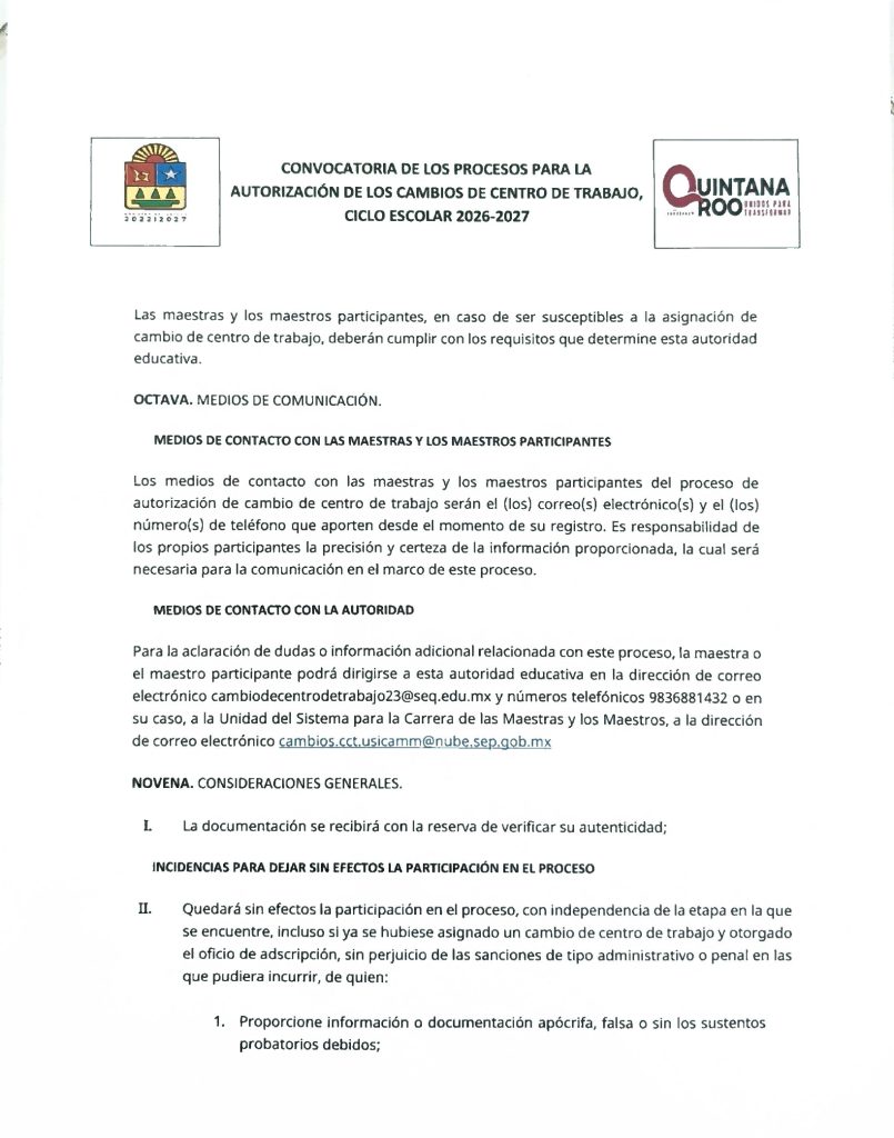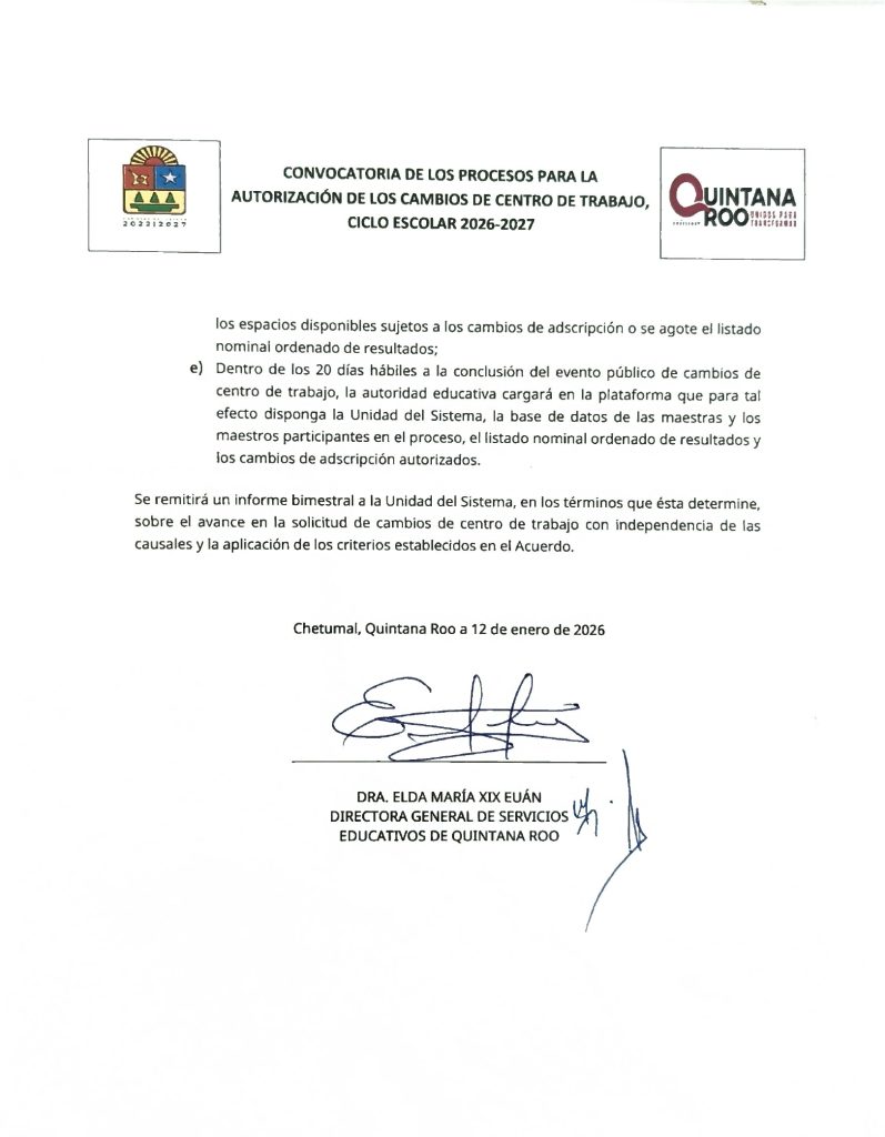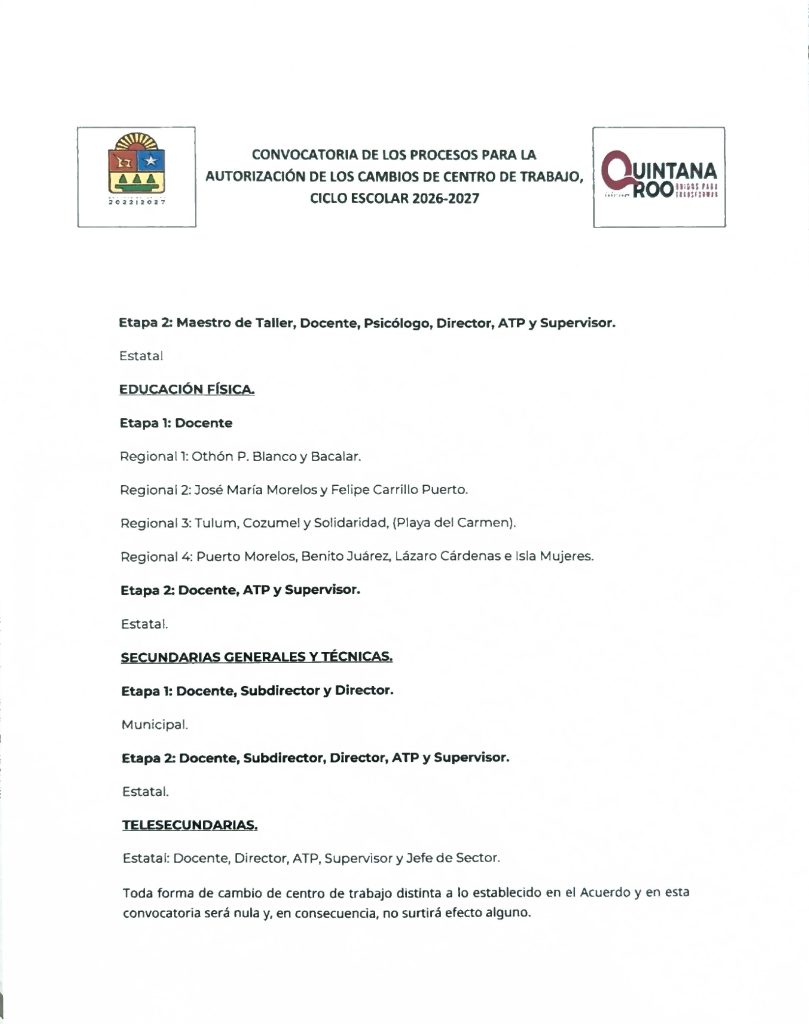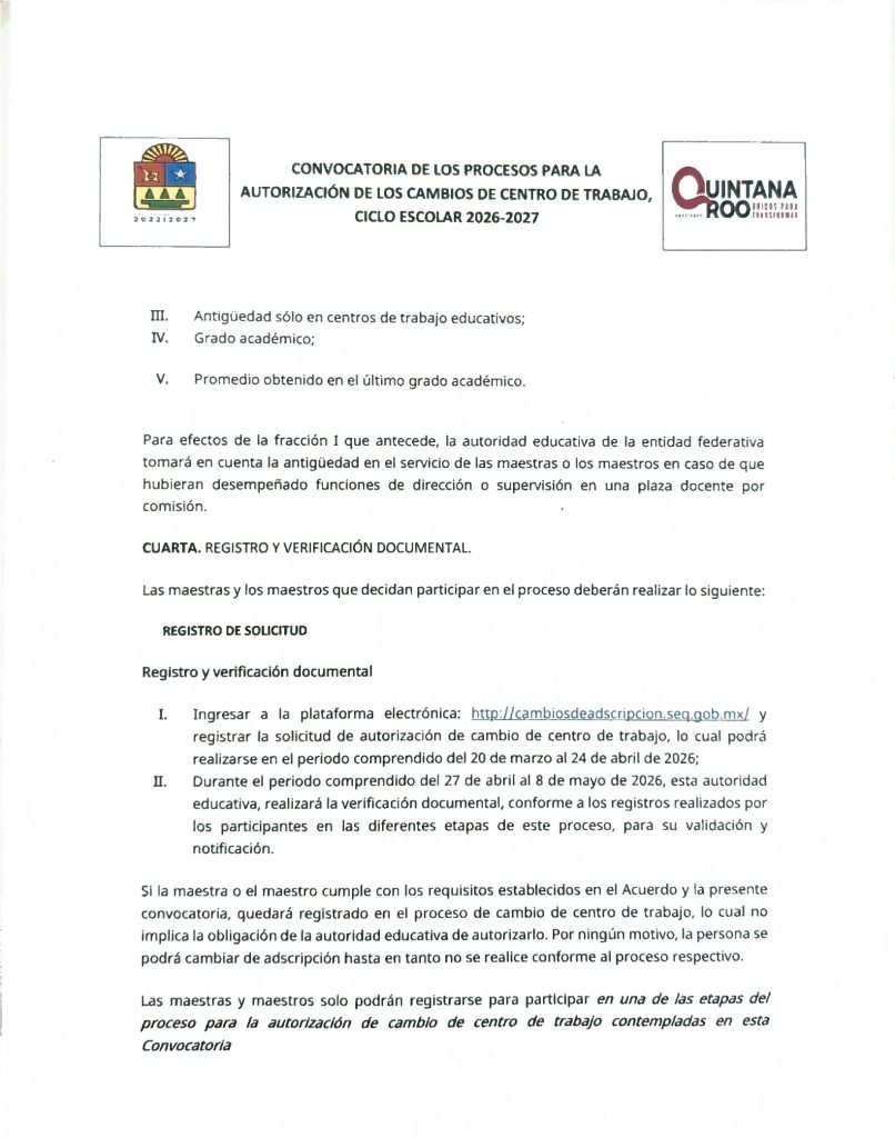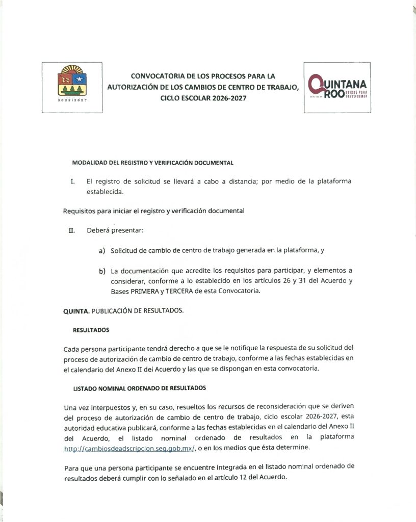 Convocatoria de los Procesos para la Autorización de los Cambios de Centro de Trabajo Ciclo Escolar 2026-2027 Quintana Roo 14/01/202612/01/2026 por Comunicación Social SEQ