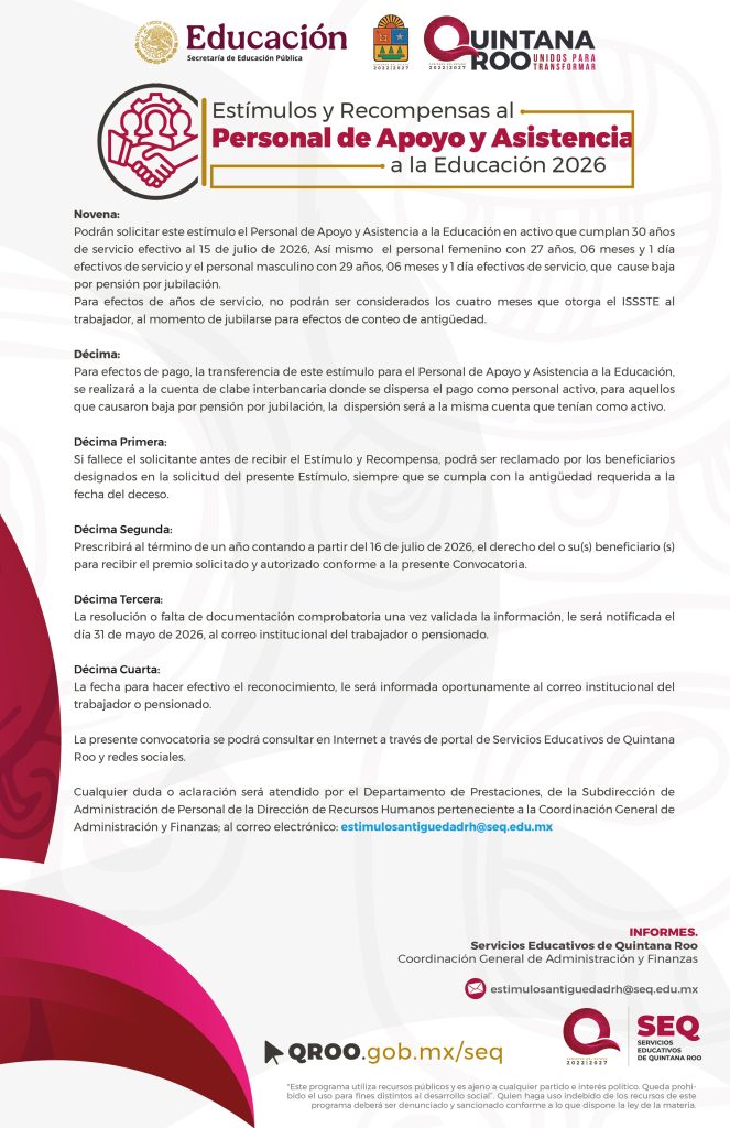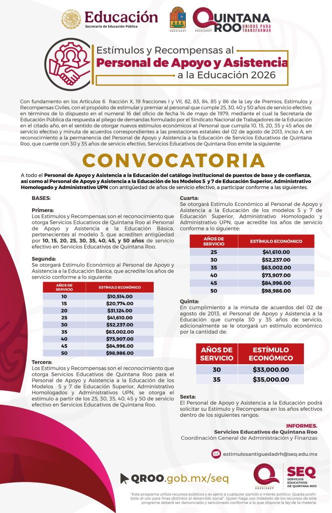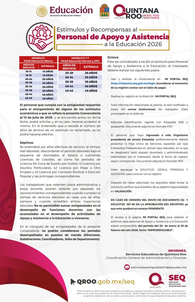 Convocatoria Estímulos y Recompensas al Personal de Apoyo y Asistencia a la Educación 2026 PAAE Quintana Roo