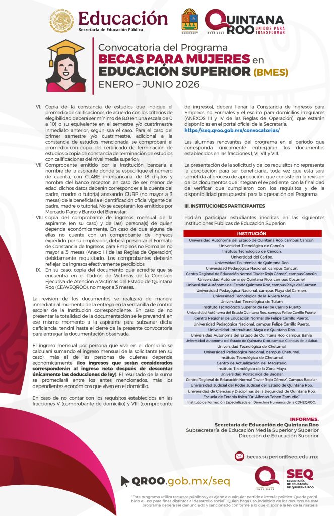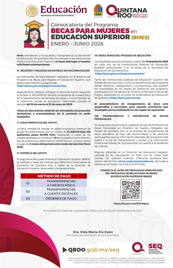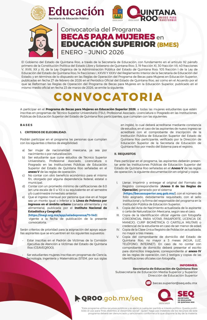 Convocatoria del Programa de Becas para Mujeres en Educación Superior (BMES) 2026 Quintana Roo / Periodo enero – junio 27/03/202626/03/2026 por Comunicación Social SEQ