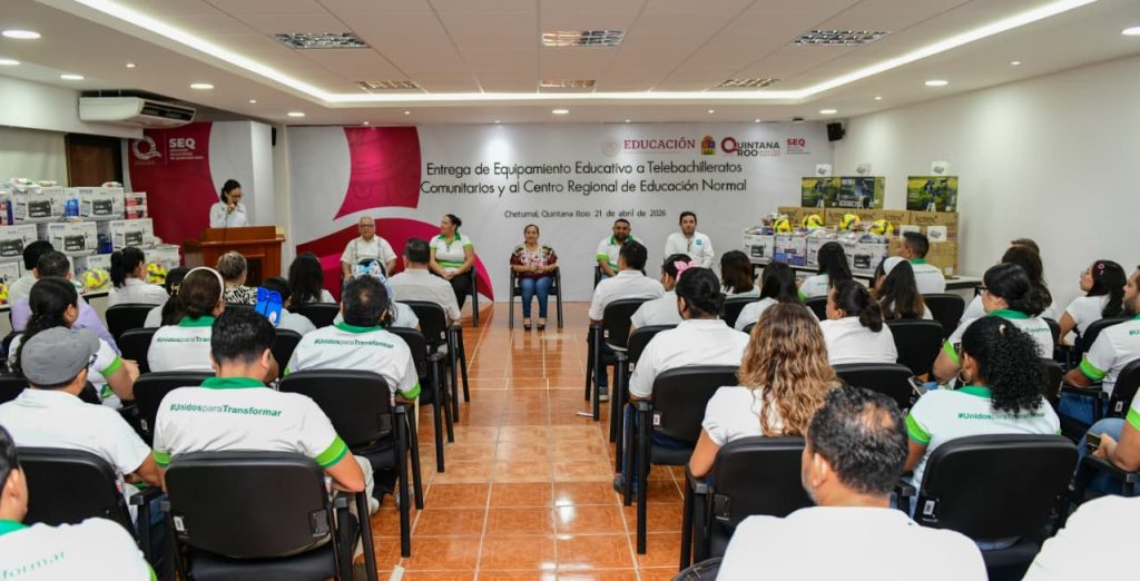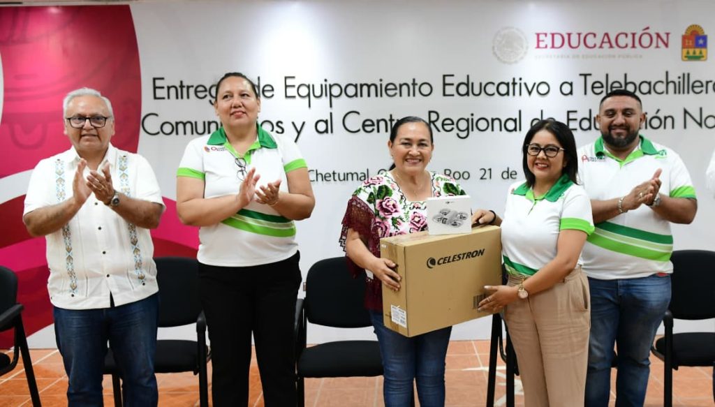 Chetumal. Los Servicios Educativos de Quintana Roo que dirige su titular, Elda Xix Euán, entregó equipamiento educativo, científico y tecnológico a los 79 Telebachilleratos Comunitarios, así como un vehículo de transporte al Centro Regional de Educación Normal de Felipe Carrillo Puerto, con la finalidad de fortalecer las condiciones de enseñanza y aprendizaje, contribuyendo al desarrollo académico, la innovación educativa y la mejora de los servicios formativos en beneficio de estudiantes y personal docente.