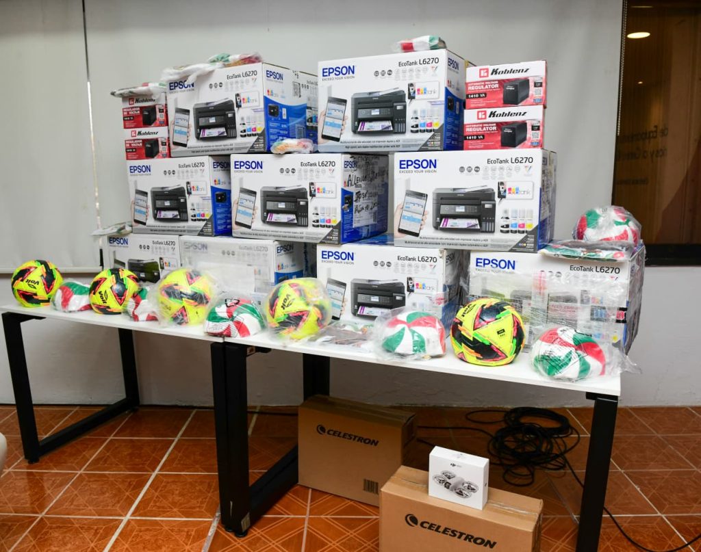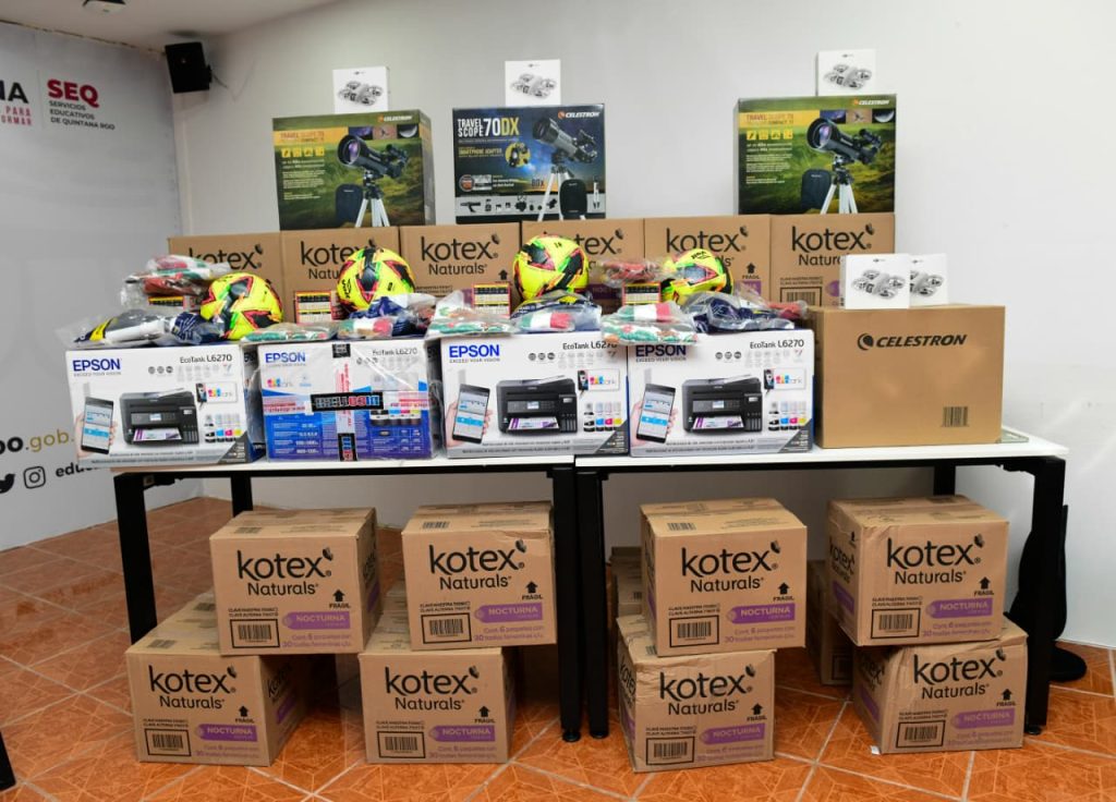 Los Telebachilleratos Comunitarios recibieron el siguiente material: 79 impresoras multifuncional Ecolank, 12 computadoras portátiles, 79 reguladores de corriente, 79 balones de fútbol, 79 de balones de basquetbol, 79 banderas con moño, 3 mil 712 paquetes de toallas sanitarias, 14 microscopios, 13 tableros de ajedrez, telescopios Travel Scope 70 DX y 80 drones DJNEO.